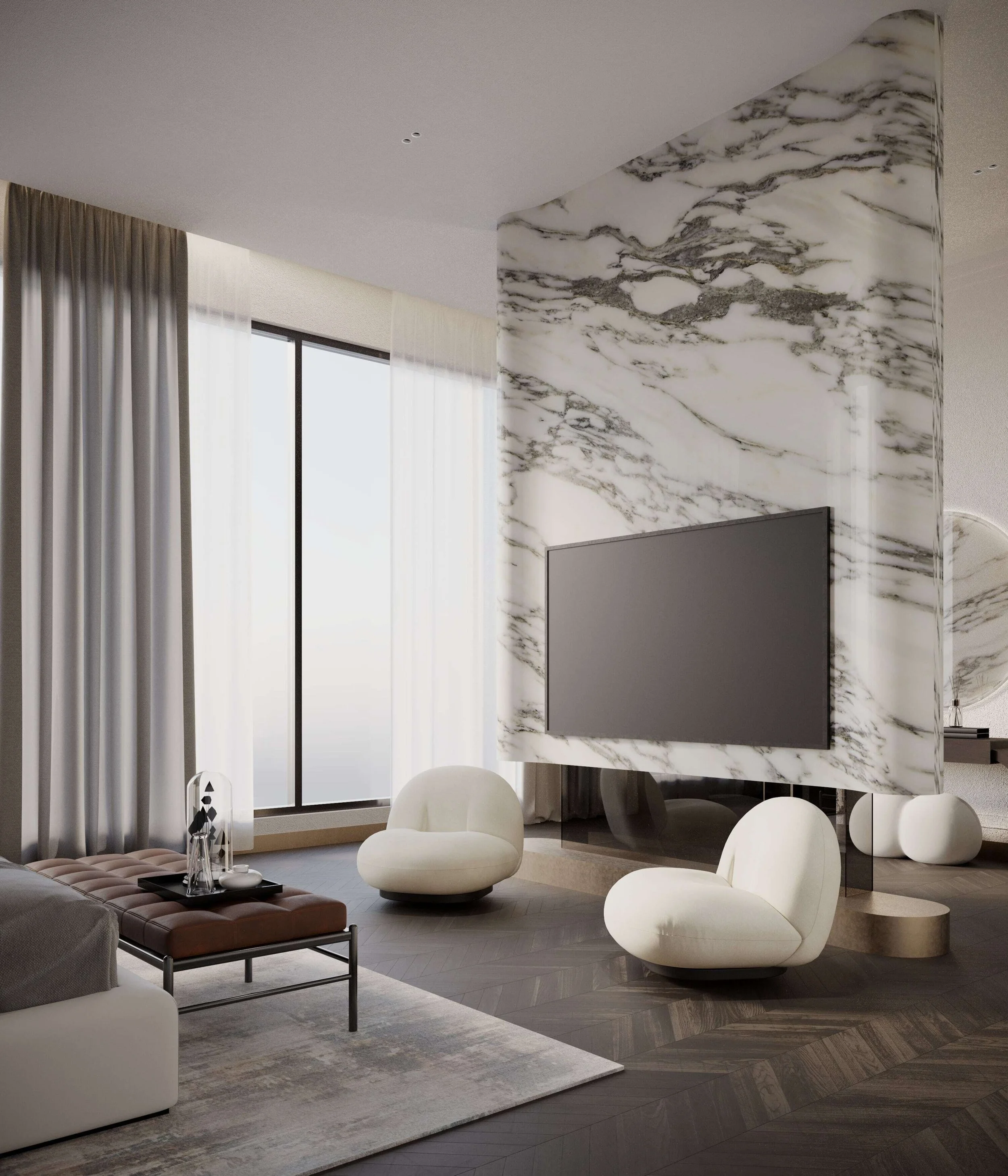 The client sought a serene yet bold sleeping sanctuary that blends sculptural modernism with high-end hospitality luxury. The goal was to create a visually immersive backdrop while maintaining a soft, inviting atmosphere conducive to relaxation and opulence.