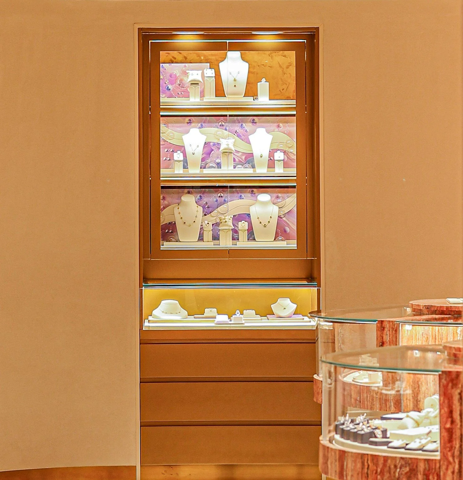 The boutique’s lighting is a celebration of Solene’s jewellery collections. Soft, integrated LED spots in the ceiling mimic a starry night sky, highlighting the displays below without overpowering the jewellery’s natural brilliance. The ambient lighting enhances the golden hues of the fixturxes and creates a luxurious yet welcoming environment. Inset wall niches with warm backlighting provide a subtle spotlight on signature pieces, inviting customers to pause and admire.